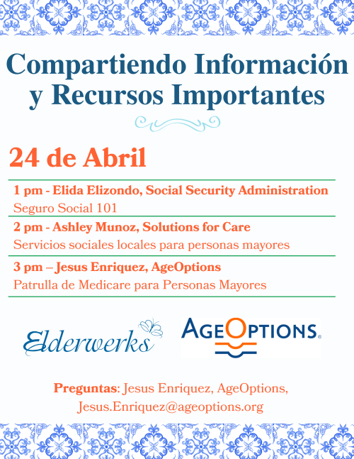 In partnership with AgeOptions, Elderwerks is presenting three virtual Spanish-speaking sessions. These sessions will cover information regarding social security, local senior resources, and Medicare.
